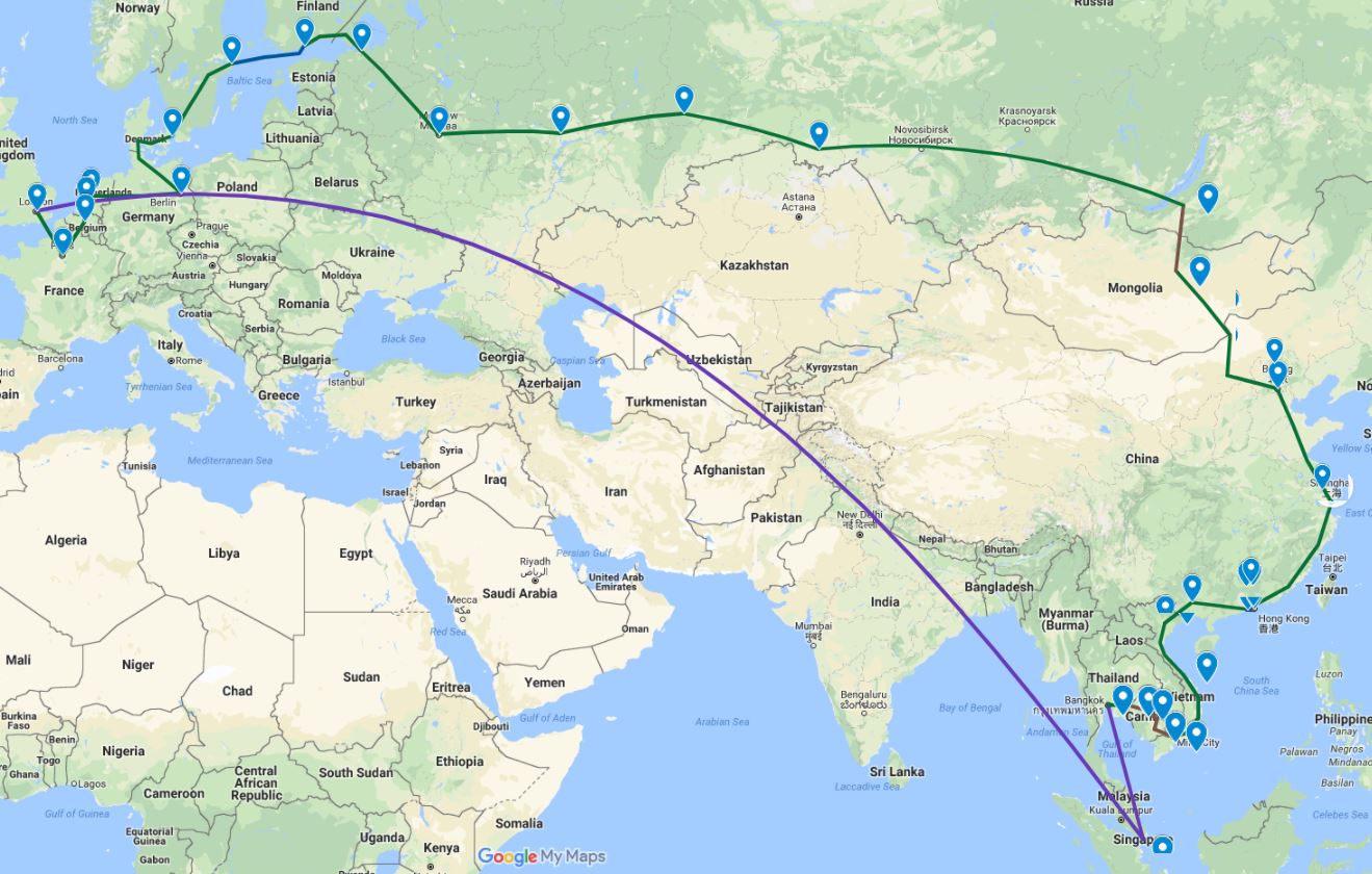 If Google Maps is accurate (and it better be), we’ll be travelling in excess of 17000km, from Singapore to London. We’ll cover two continents. At least 14 countries. And almost 30 cities. I’ll update this post if and when our route changes as we make our way to the UK. But for now, our route looks something like this: