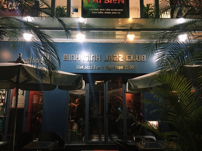 Around 8.30pm, we entered the Binh Minh Jazz Club, located just behind the opera house. This small and intimate bar/jazz club serves up live jazz every night from 9pm. In a corner of the bar, there was an elderly man with “museum curator” glasses smoking a cigar. The musicians’ faces were illuminated only by dim spotlights and pink neon lights from the bar’s sign. The atmosphere inside was truly mysterious and strangely alluring, almost reminiscent of lounges from film noir movies.