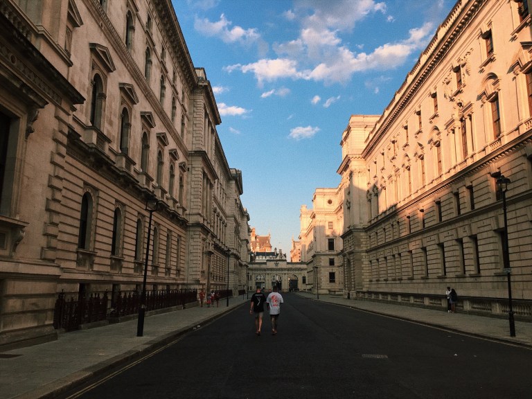 After dinner, we continued our strolling tour of London, beginning with Buckingham Palace. We tried to take a few nice photos, but the angle of the evening sun was working against us. So, we decided to head to 10 Downing Street instead. Unknown to us however, 10 Downing Street was not open to the public: when we arrived at the address, a large gate separated us from the “gated community” that 10 Downing Street existed in.